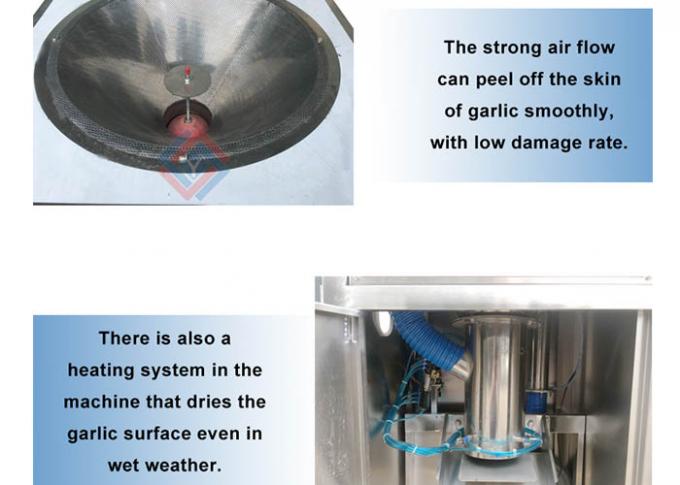 1. Przyjmuje specjalną konstrukcję do obierania. Podczas procesu obierania czosnek nie przechodzi przez ostrze ani tarcie, aby zapewnić integralność, świeżość i czystość.